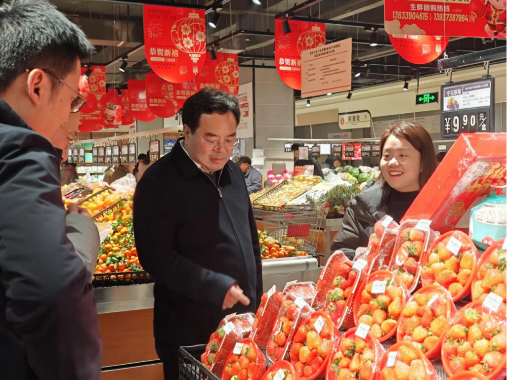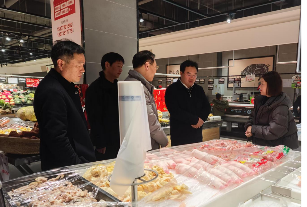 正在万德隆糊口超市,祝显成取超市担任人细致扳谈,食用油、蔬菜、生果等糊口物资的价钱,扣问领会肉类等食物平安检测以及进货渠道、查验检疫和储蓄办理等环境。